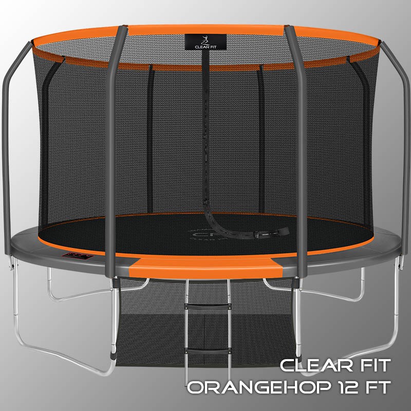 В 2026 году представлена обновленная линейка с улучшенной конструкцией каркаса. Усиление достигнуто за счет использования прочных Т-образных кронштейнов из металла толщиной 1.9 мм. Кроме того, в комплектацию добавлен карман для обуви. Каркасный батут с защитной сеткой Clear Fit серии OrangeHop — отличаются комфортом и надежностью. Надежная рама из качественных комплектующих, прочная защитная сеть снабжена прямым креплением к прыжковому полотну и дополнительной защитой входа, наверху каркасное жесткое крепление, сеть не провисает и не слетает во время тренировок. Увлекательный, полезный и безопасный тренажер для всей семьи. Батуты серии OrangeHop 10Ft, 12Ft, 14Ft и 16Ft поставляются в оптимальной для комфорта и безопасности комплектации: батут, верхняя защитная сеть, защитный мат, лестница и карман для обуви. Батут размером в 12 футов с прыжковой поверхностью 3.21 м идеально подходит для пользователей любого возраста, размеры полотна позволяют комфортно тренироваться взрослым и развлекаться детям, включая подростков. Верхняя защитная сеть оберегает от падений, усиленная молния и дополнительная защита входа уберегут малышей от случайного входа или падения. Надежный каркас из оцинкованной стали, качественные комплектующие и погодостойкие гальванизированные метизы рамы делает батут безопасным, устойчивым, надежным, гарантируют полную защиту от коррозии и долгий срок службы. Максимальный вес пользователя батута OrangeHop 12Ft — до 200 кг.