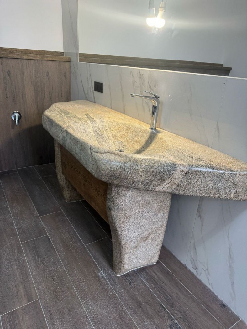Каменная раковина задаёт тон всей ванной комнате, превращая утилитарное пространство в предмет интерьерного искусства.