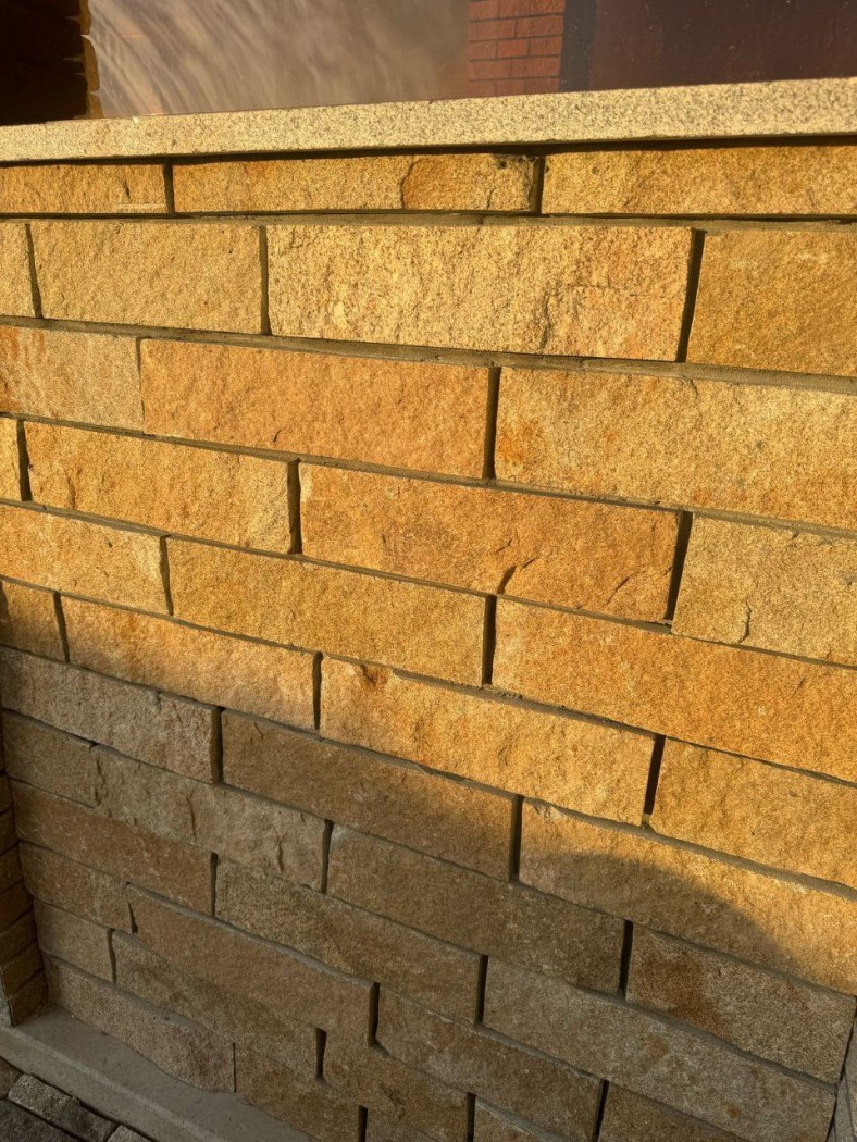 Жёлтый гранитный кирпич — это отделочный камень, вырезанный из натурального сортового гранита с золотистыми, охристыми, песчаными и янтарными тонами. Используется в фасадной и цокольной облицовке, а также в декоративных наружных и внутренних решениях. Жёлтый оттенок добавляет тепла в архитектуру, особенно эффектно выглядит на солнце и в контрасте с тёмной кровлей.