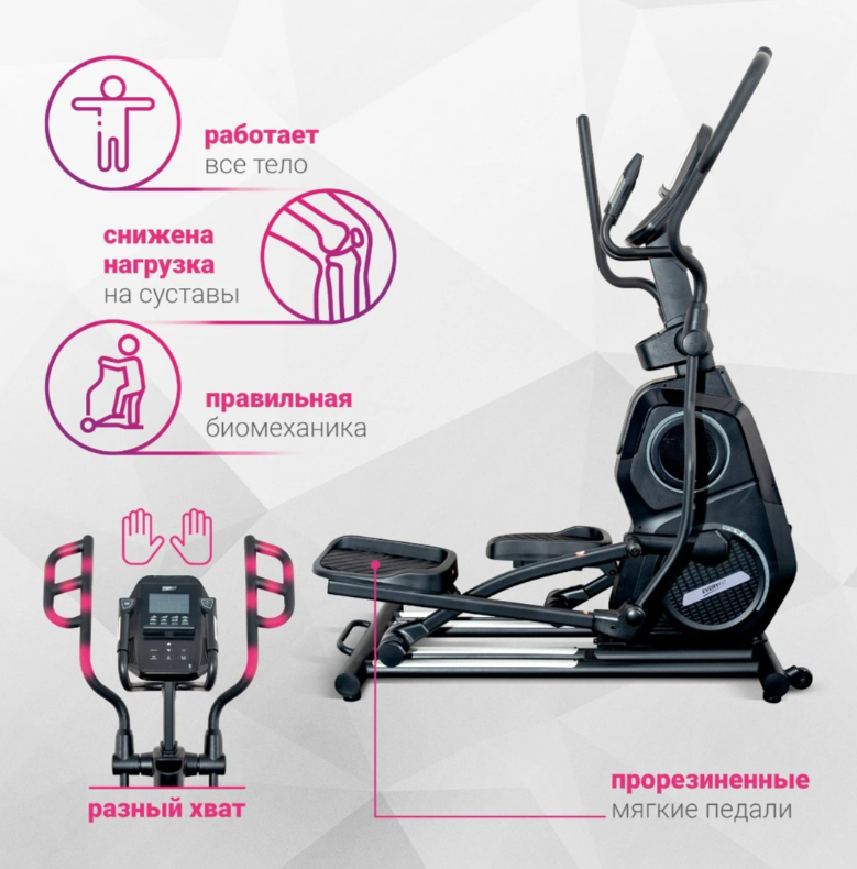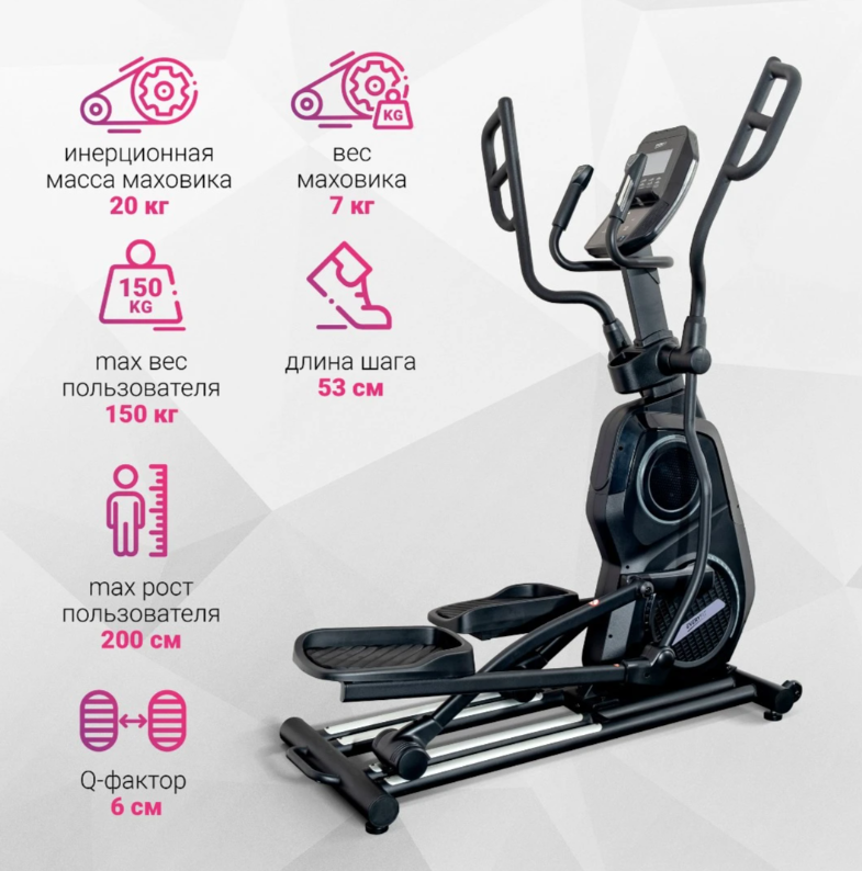 Длина шага 53 см и Q-фактор всего 6.5 см позволяют тренироваться с правильной биомеханикой. Тренажер имитирует естественные движения, уменьшая нагрузку на суставы и позвоночник.