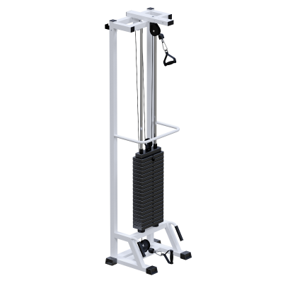 Грузоблочный стек состоит из металлических обрезиненных плит по 5 кг с хромированными направляющими. Регулировка нагрузки осуществляется при помощи металлической иглы-фиксатора. Передача усилия реализована через трос диаметром 5 мм в ПВХ-оплётке с разрывным усилием 500 кг и допустимой рабочей нагрузкой до 800 кг, что формирует высокий запас прочности.