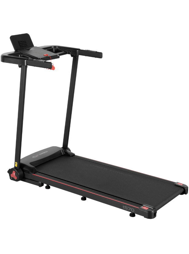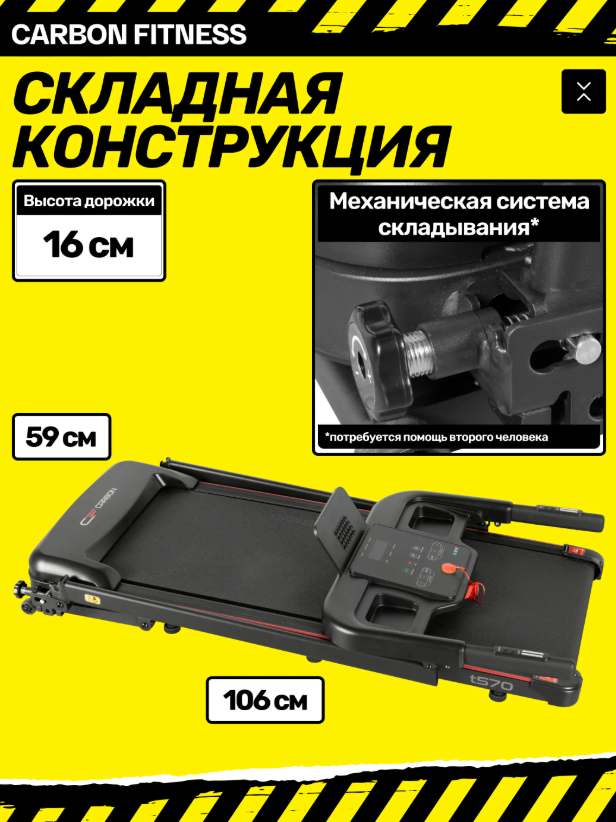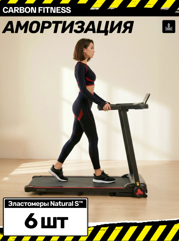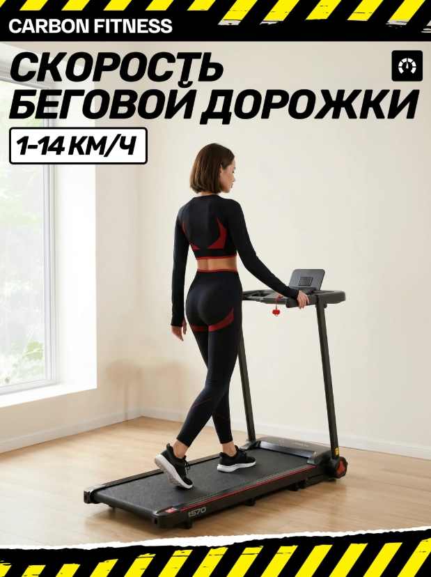 CARBON FITNESS T570 — электрическая беговая дорожка для домашних тренировок, ориентированная на пользователей, которым важны мощный двигатель, широкий диапазон нагрузок и комфорт управления. Модель подойдёт для регулярной ходьбы и бега, а также для более интенсивных кардиотренировок с изменением угла наклона и контролем пульса. T570 сочетает компактность домашнего формата с функциональностью, близкой к клубному уровню. Дорожка выполнена на высокопрочной раме с антикоррозийной обработкой и однослойной покраской, рассчитанной на стабильную эксплуатацию. Корпус изготовлен из износостойкого ABC-пластика. Беговое полотно толщиной 1,6 мм и размером 105 × 39 см обеспечивает комфортную зону для ходьбы и бега. Парафинированная дека из МДФ толщиной 11 мм способствует плавному ходу и долговечности конструкции. Одно из ключевых преимуществ модели — электронная регулировка угла наклона с 15 уровнями, позволяющая точно управлять нагрузкой и эффективно имитировать подъёмы для усиленной проработки мышц. CARBON FITNESS T570 оснащена современным бесщеточным двигателем 2.0 Leeson Electric с пиковой мощностью 3.0 л.с.. Такой тип мотора отличается высокой надёжностью, тихой работой и увеличенным ресурсом, что особенно важно при регулярных тренировках. Диапазон скорости — от 1 до 14 км/ч, подходит как для спокойной ходьбы, так и для динамичного бега. Консоль: • LED-дисплей, • отображение показателей: время, скорость, дистанция, калории, уровень наклона, пульс, • сенсорные датчики пульса на поручнях. Для удобства пользователя предусмотрены: • подставка под планшет или смартфон, • отсеки для аксессуаров. CARBON FITNESS T570 — надёжная и функциональная беговая дорожка для домашних тренировок, предлагающая мощность, точную настройку нагрузки и комфорт в компактном формате.